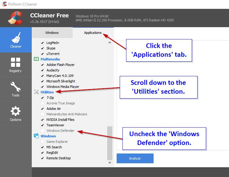 In ccleaner – remove the checkmark next to ‘Windows Defender’.